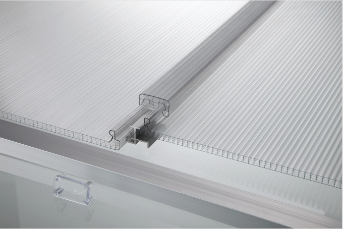 Panel self-lock berbentuk U memiliki sistem penghubung khusus tersendiri. Tidak perlu menggambar lubang untuk sekrup pada lembaran. Dengan demikian dapat memastikan 100% air dan bukti debu. kami menawarkan serangkaian aksesori lengkap untuk panel sistem polikarbonat berbentuk U untuk memastikan pemasangan yang mudah dan rendah.